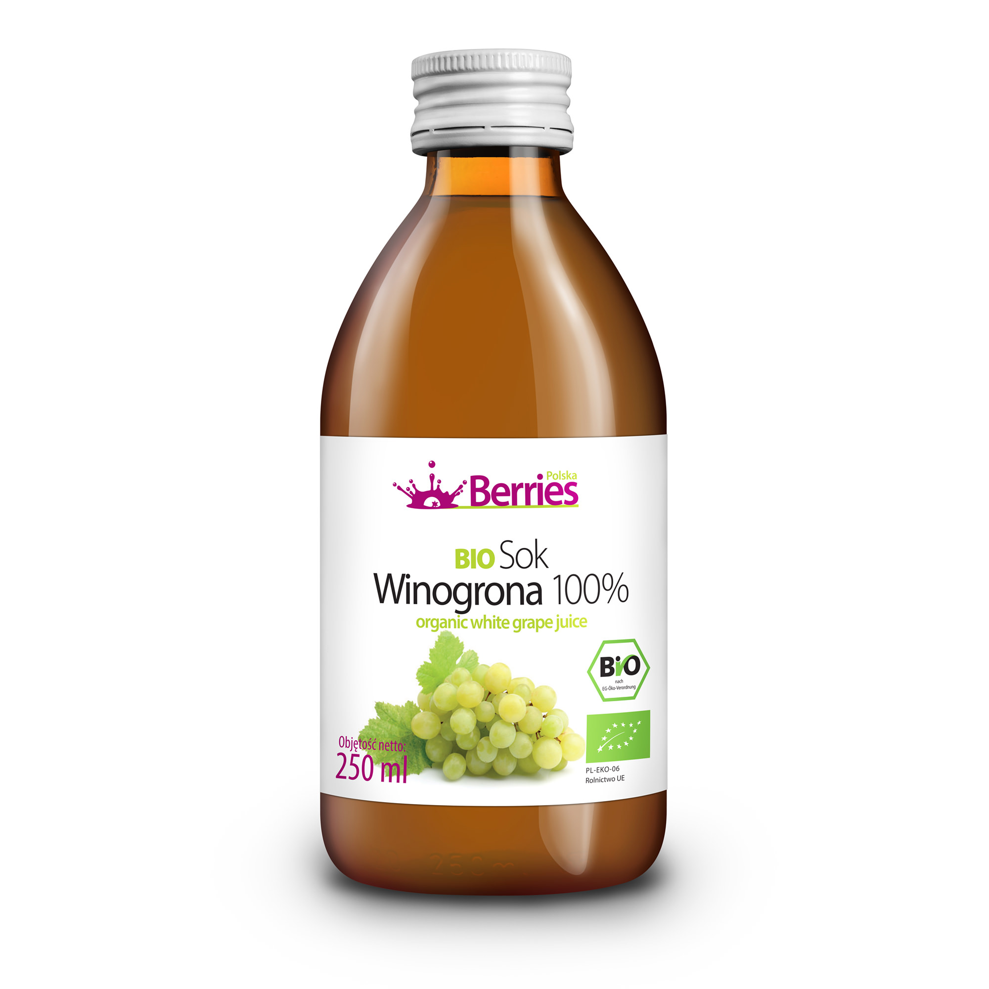 BIO sok NFC z białych winogron (100%) wyciskany bezpośrednio z ekologicznych białych winogron – nie z koncentratu. Tłoczony na zimno, bez dodatku cukru – zawiera naturalnie występujące w owocach cukry. Poddany procesowi delikatnej pasteryzacji, który przedłuża trwałość produktu, a jednocześnie pozwala zachować jego najcenniejsze właściwości.